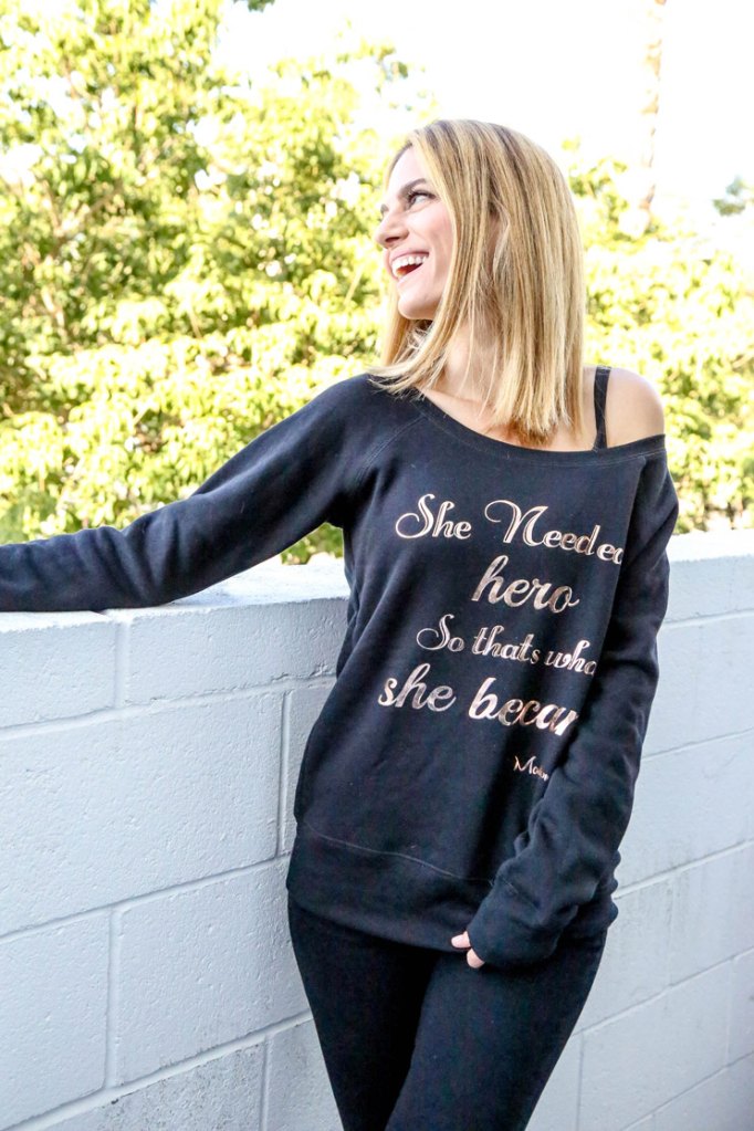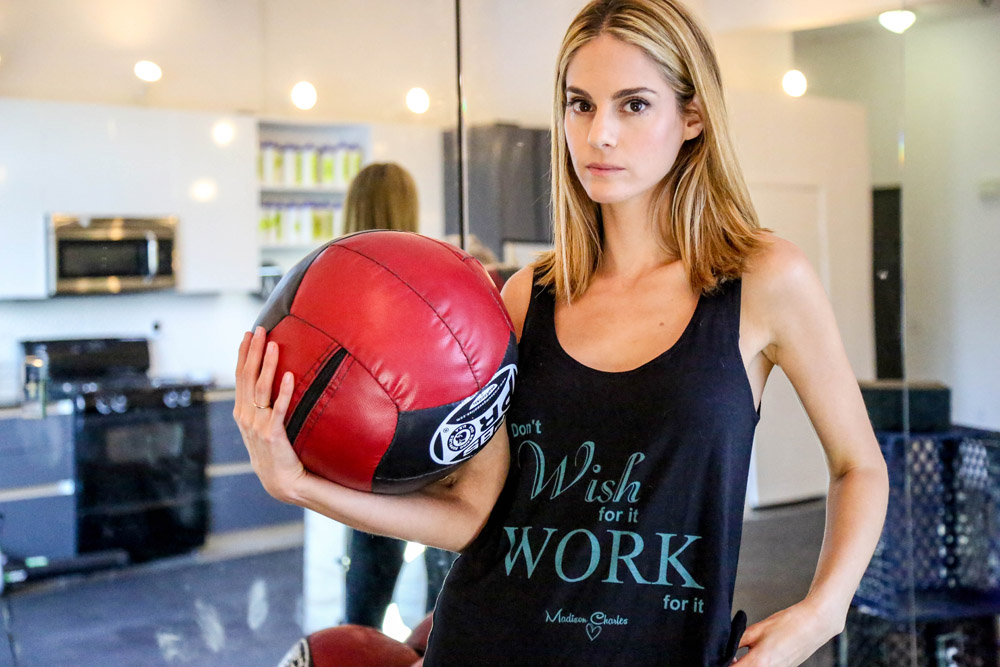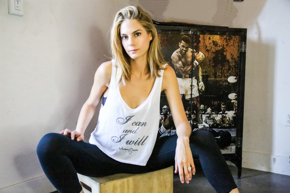 Inspiring quotes play a big role in the message of her line. “I’ve been obsessed with quotes my whole life,” she notes. “When I was 12 years old, I had a journal with quotes. I had a really hard childhood, and I needed what I needed to keep me going and keep me inspired. [Later on in life,] I started painting quotes on 8×10 or 11×14 canvases, and I would put them on my wall in my office. Before I knew it, I filled up an entire wall of famous quotes that inspired me. Every morning, I would get up and stand in front of them and read the quotes, and that’s how I would start my day. It would keep me focused and motivated. I have hundreds and hundreds of quotes that I love, so the hardest part was picking my top three right now, so for this first run, it’s a little bit more motivational, fitness-wise. Moving forward, every month there’s going to be a quote of the month, and that specific quote on the tank or tee will only be available that month, and then once it’s sold out, it’s done.”