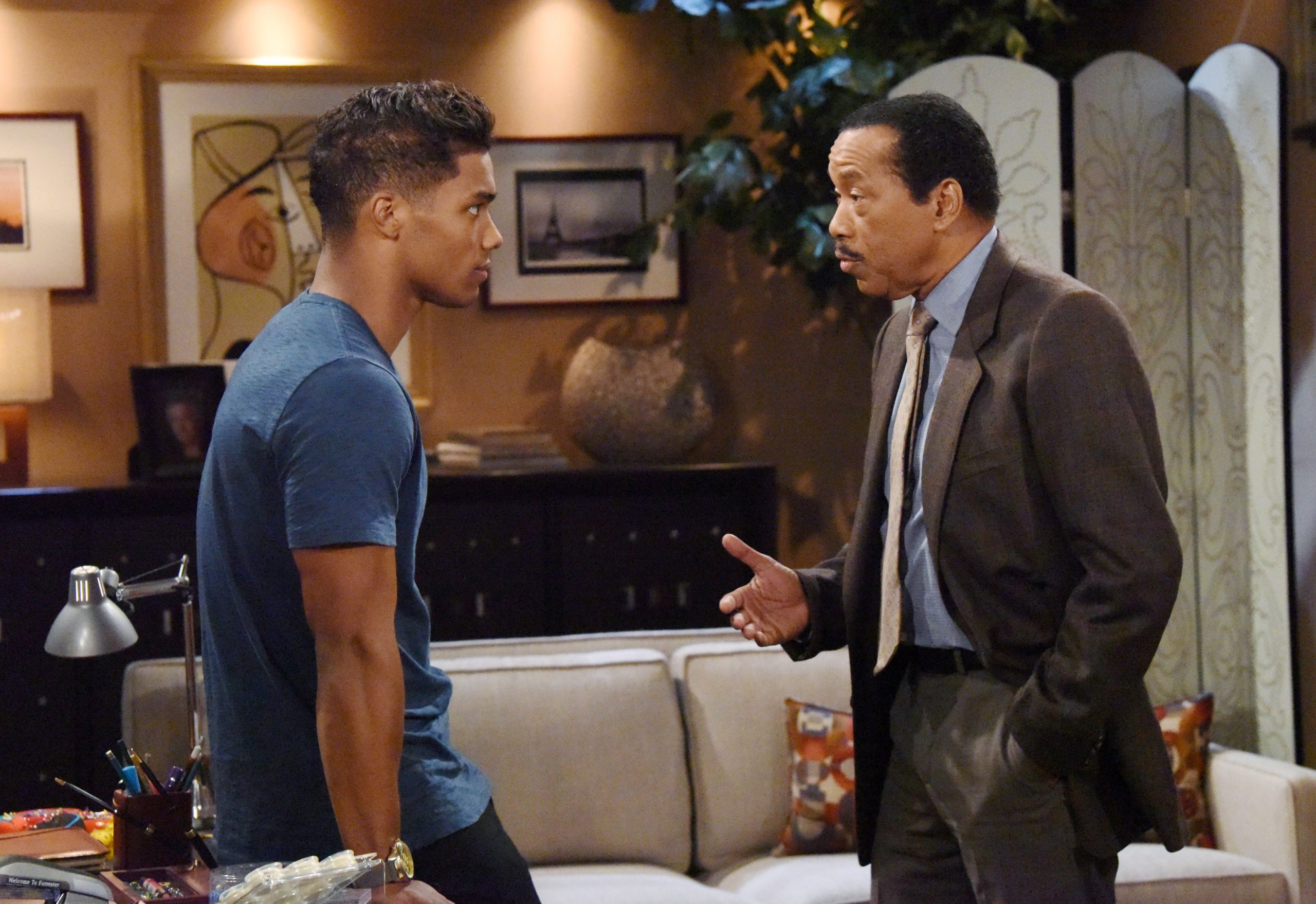 John McCook and Delon De Metz on THE BOLD AND THE BEAUTIFUL, airing October 8, 2020. (1:30-2:00 PM, ET; 12:30-1:00 PM, PT) on the CBS Television Network. Photo: Sonja Flemming/CBS 2020 CBS Broadcasting, Inc. All Rights Reserved JPI October 2020 After his split with Nicole, Zende (Delon de Metz) returned to L.A. from Paris and joined the Hope For The Future line as its lead designer, which delighted his grandfather, Eric (John McCook). -