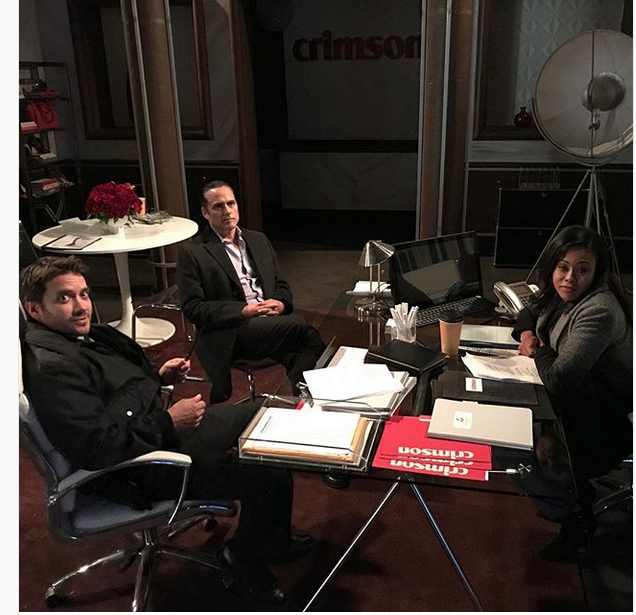 Instagram “Should Nina be worried about her job?” quipped GH’s official Instagram account of this shot at the Crimson offices of (from l.) Dominic Zamprogna (Dante), Maurice Benard (Sonny) and Vinessa Antoine (Jordan). GENERALHOSPITALABC/INSTAGRAM -