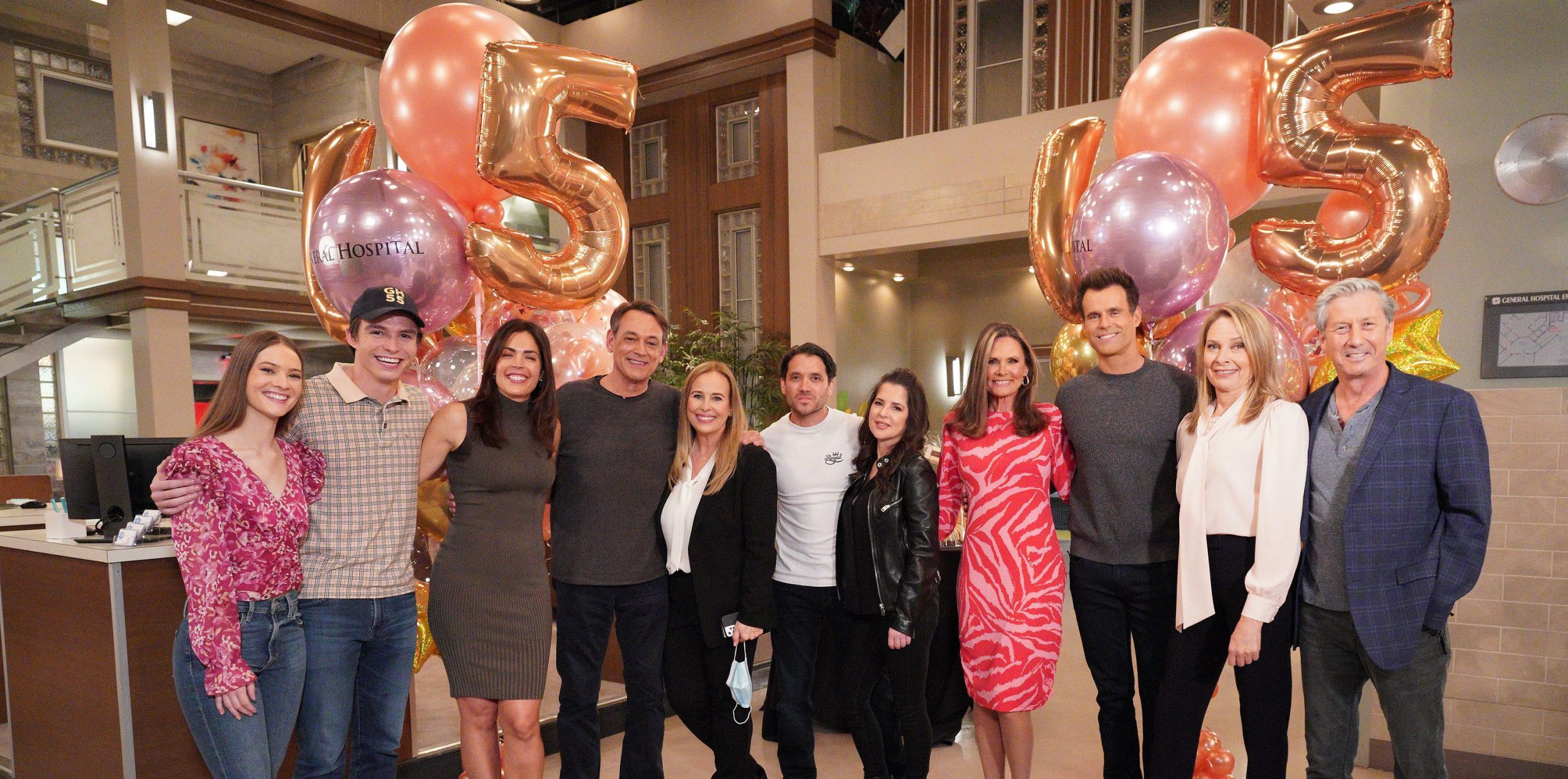 Twitter GH’s Avery Pohl (Esme), Nicholas Chavez (Spencer), Kelly Thiebaud (Britt), Jon Lindstrom (Kevin), Dominic Zamprogna (Dante), Kelly Monaco (Sam), Lynn Herring (Lucy), Cameron Mathison (Drew), Bonnie Burroughs (Gladys) and Charles Shaughnessy (Victor) flanked Genie Francis (Laura) at an on set party to celebrate her 45th anniversary as Laura on February 8.