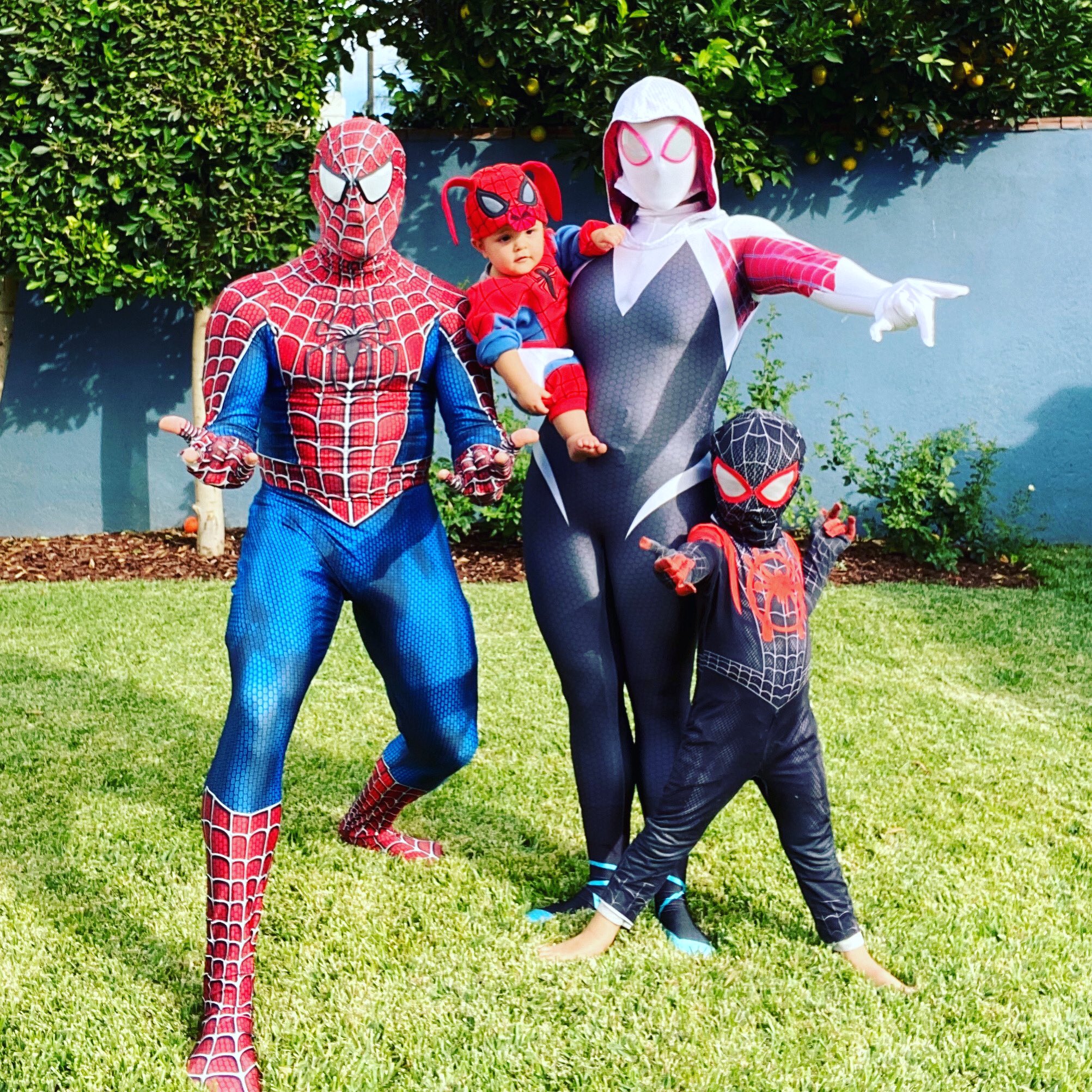 Instagram OLTL alums David Fumero (ex-Cristian), wife Melissa Fumero (ex-Adriana), and sons Enzo and Axel dressed as different variations on the superhhero Spiderman.
